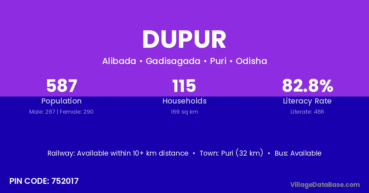 Puri (32 km) is the nearest town to Dupur village for major economic activities and is located approximately 32 km away.