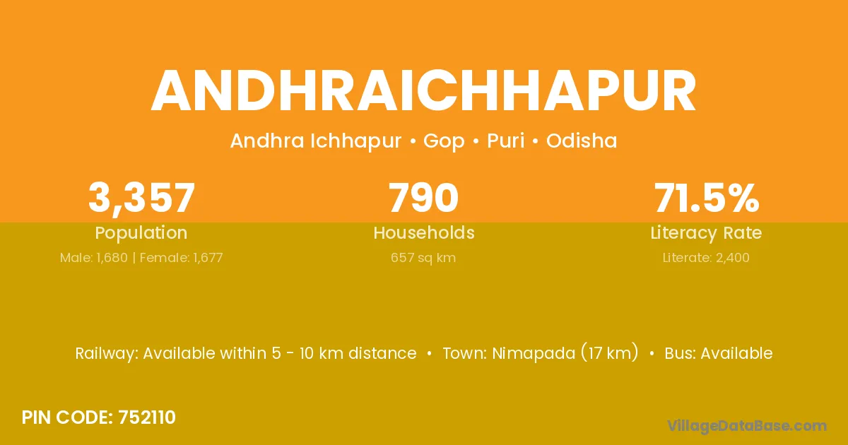Nimapada (17 km) is the nearest town to Andhraichhapur village for major economic activities and is located approximately 17 km away.