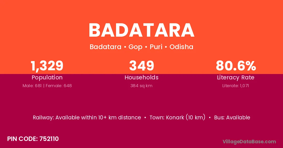 Konark (10 km) is the nearest town to Badatara village for major economic activities and is located approximately 10 km away.