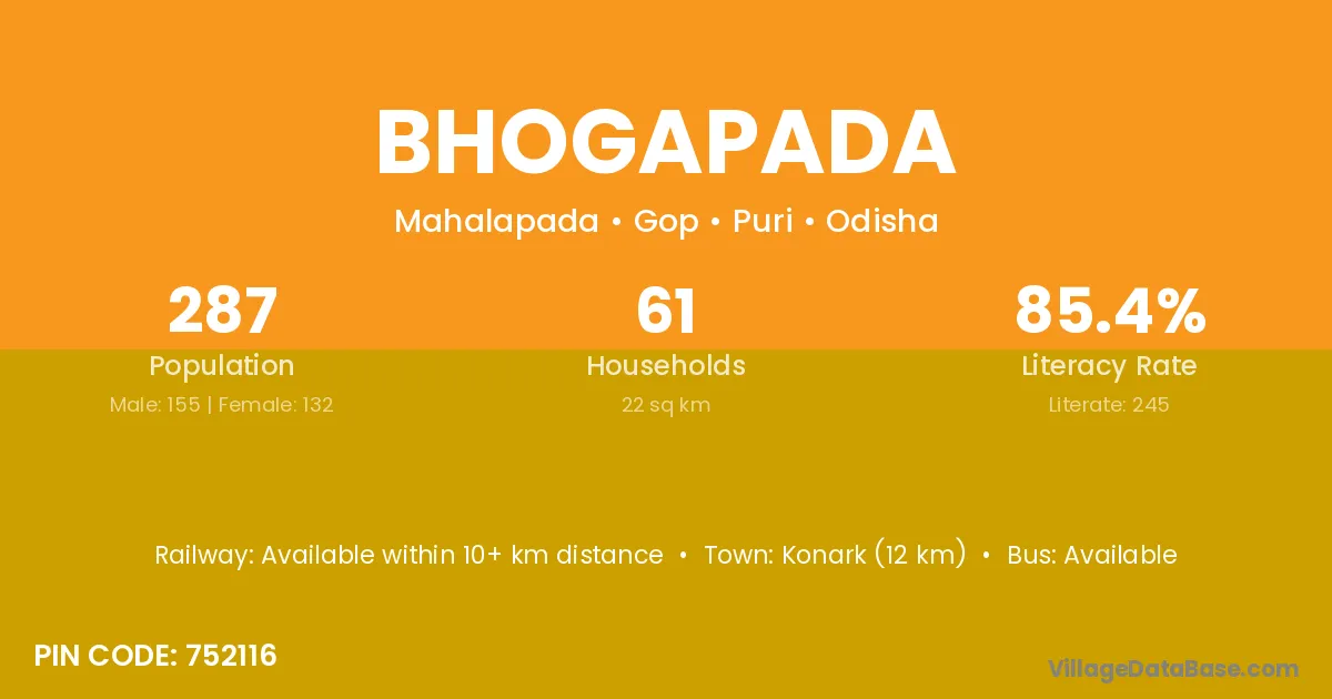 Konark (12 km) is the nearest town to Bhogapada village for major economic activities and is located approximately 12 km away.