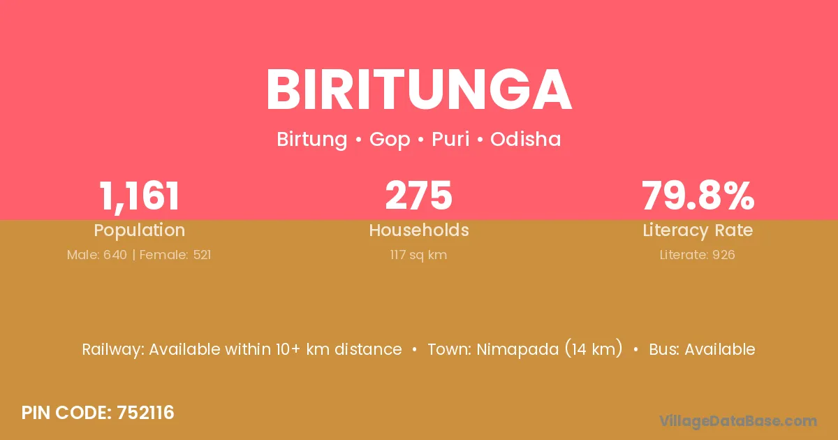 Biritunga village has a total population of 1,161 people, of which 640 are males and 521 are females.