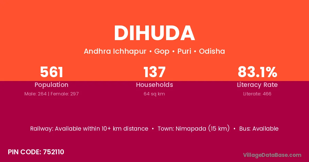 Nimapada (15 km) is the nearest town to Dihuda village for major economic activities and is located approximately 15 km away.