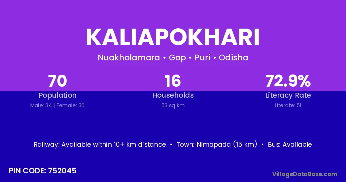 Kaliapokhari village has a total population of 70 people, of which 34 are males and 36 are females.
