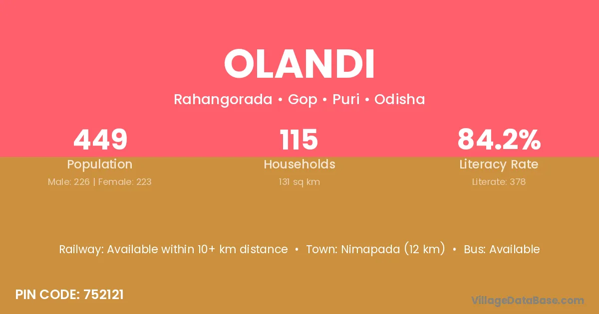 Olandi village has a total population of 449 people, of which 226 are males and 223 are females.