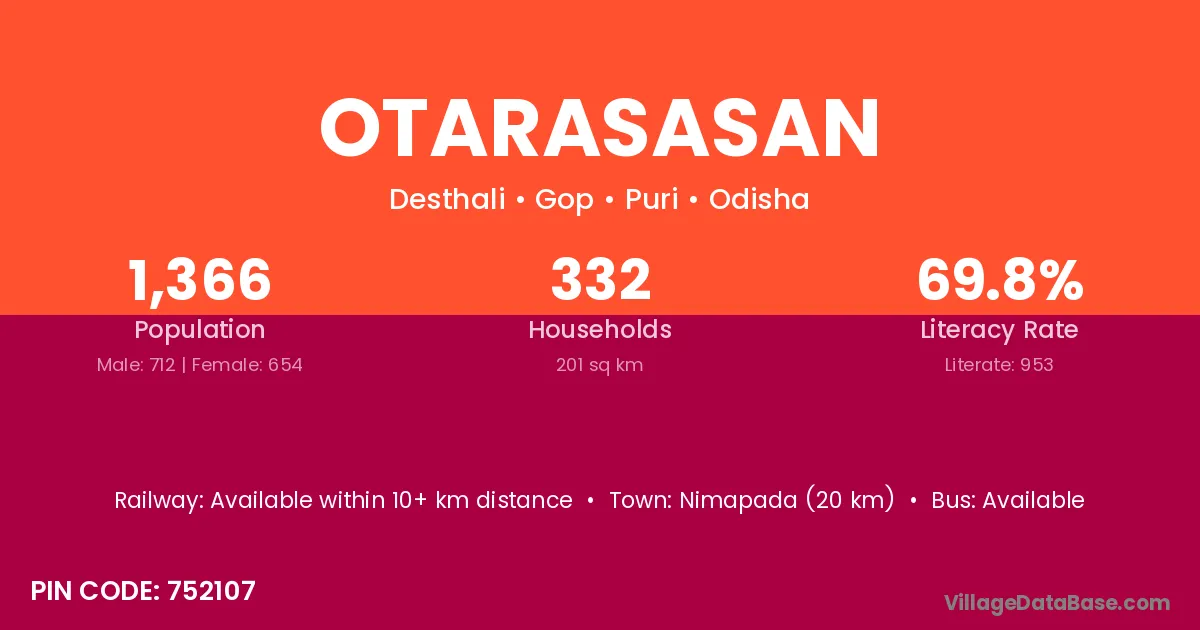 Nimapada (20 km) is the nearest town to Otarasasan village for major economic activities and is located approximately 20 km away.