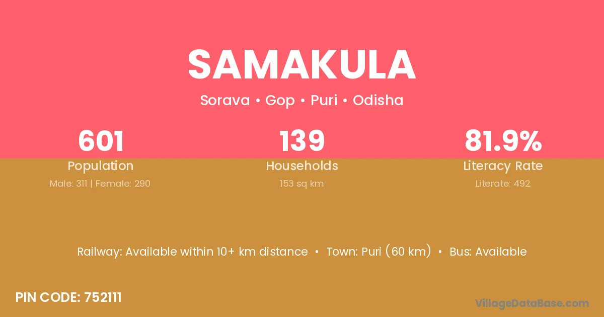 Puri (60 km) is the nearest town to Samakula village for major economic activities and is located approximately 60 km away.