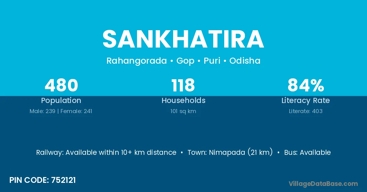 Sankhatira village has a total population of 480 people, of which 239 are males and 241 are females.
