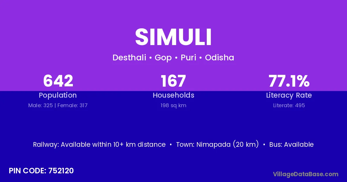Nimapada (20 km) is the nearest town to Simuli village for major economic activities and is located approximately 20 km away.