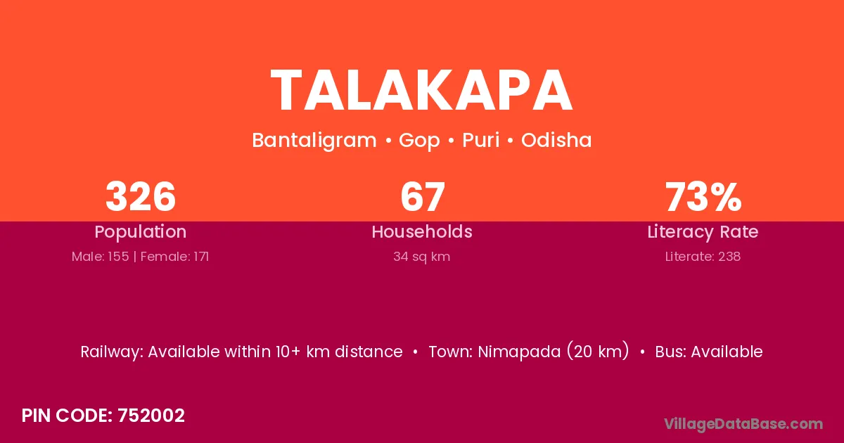 Nimapada (20 km) is the nearest town to Talakapa village for major economic activities and is located approximately 20 km away.