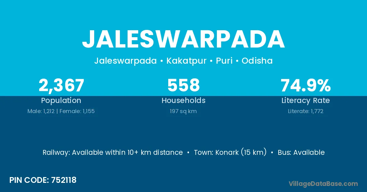 Konark (15 km) is the nearest town to Jaleswarpada village for major economic activities and is located approximately 15 km away.
