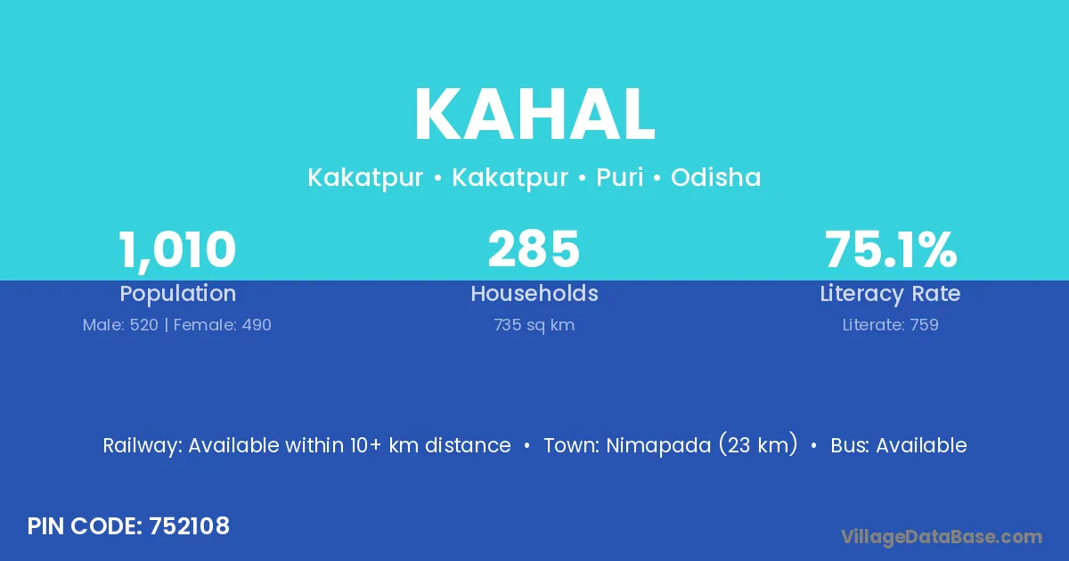 Nimapada (23 km) is the nearest town to Kahal village for major economic activities and is located approximately 23 km away.