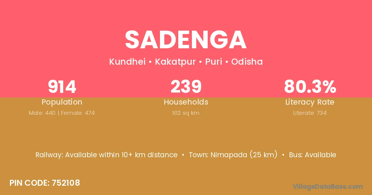 Nimapada (25 km) is the nearest town to Sadenga village for major economic activities and is located approximately 25 km away.