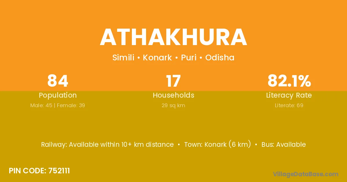 Konark (6 km) is the nearest town to Athakhura village for major economic activities and is located approximately 6 km away.
