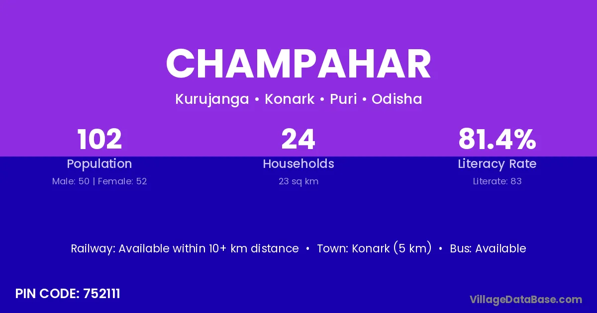 Konark (5 km) is the nearest town to Champahar village for major economic activities and is located approximately 5 km away.