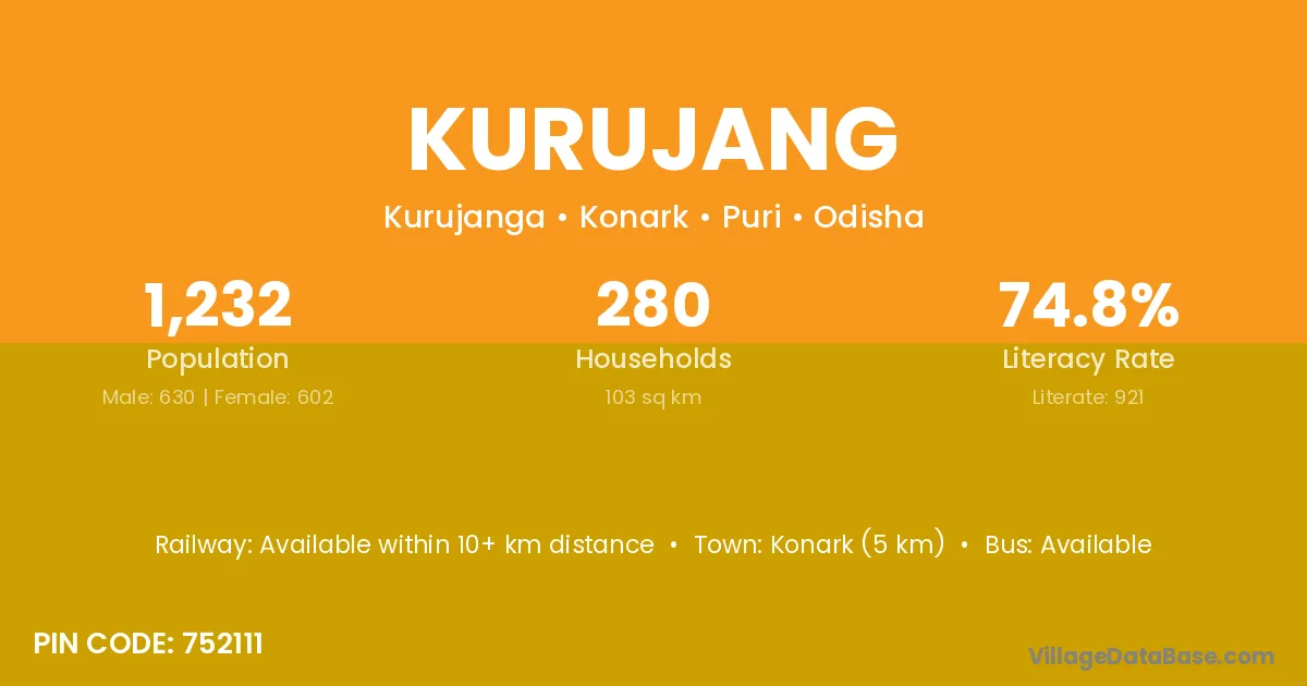 Konark (5 km) is the nearest town to Kurujang village for major economic activities and is located approximately 5 km away.