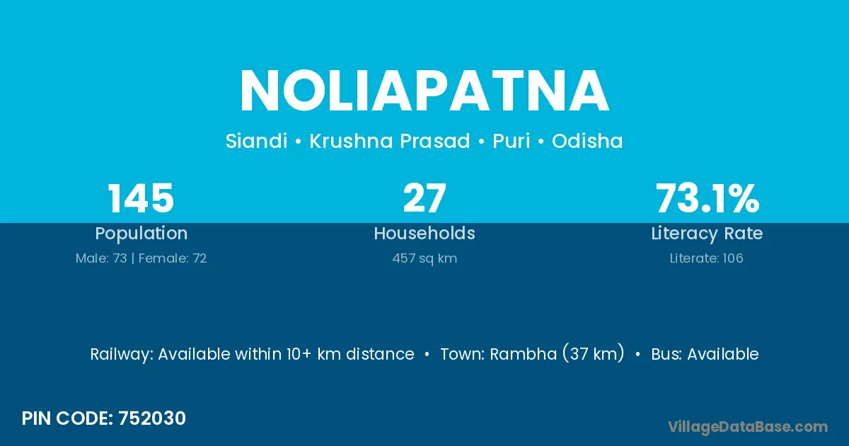 Rambha (37 km) is the nearest town to Noliapatna village for major economic activities and is located approximately 37 km away.