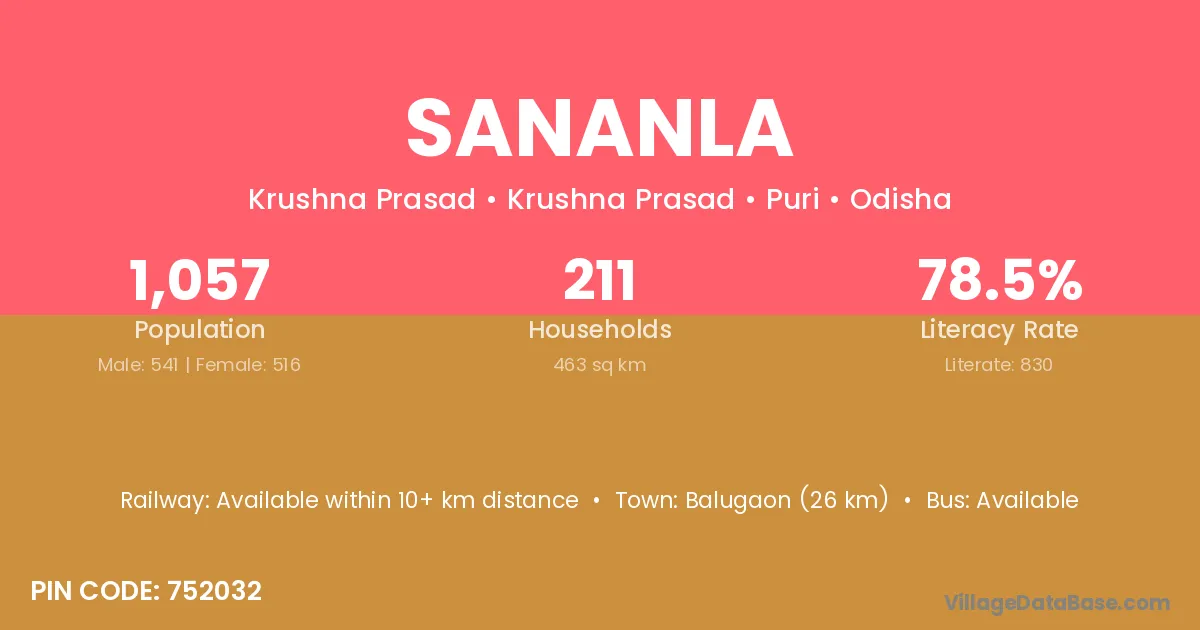 Balugaon (26 km) is the nearest town to Sananla village for major economic activities and is located approximately 26 km away.