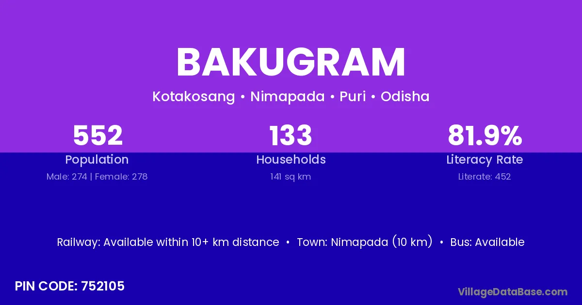 Bakugram village has a total population of 552 people, of which 274 are males and 278 are females.