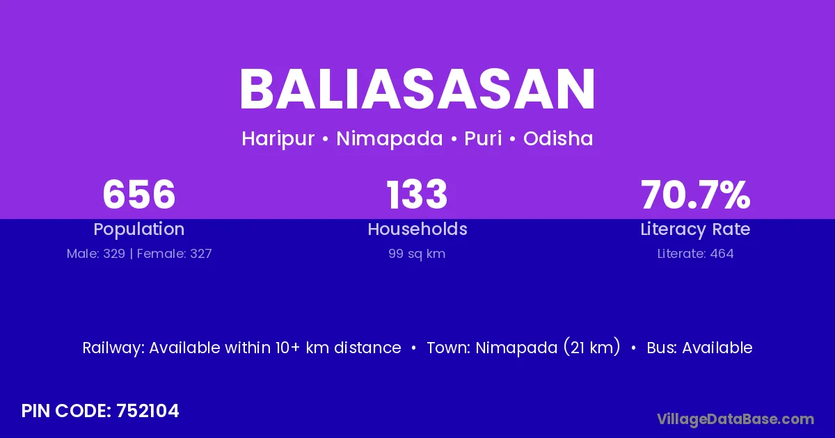 Nimapada (21 km) is the nearest town to Baliasasan village for major economic activities and is located approximately 21 km away.