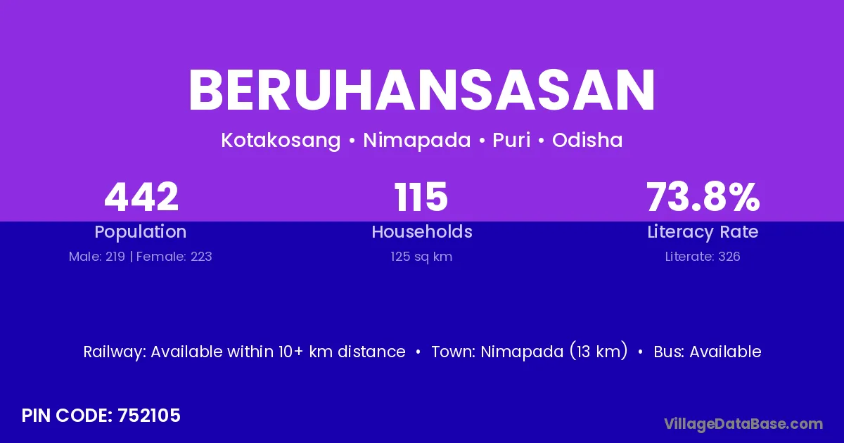 Nimapada (13 km) is the nearest town to Beruhansasan village for major economic activities and is located approximately 13 km away.