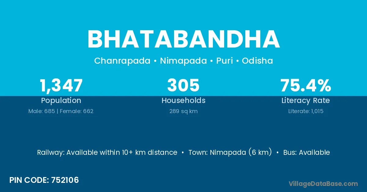 Bhatabandha village has a total population of 1,347 people, of which 685 are males and 662 are females.
