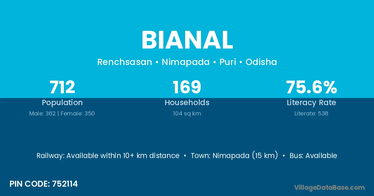 Nimapada (15 km) is the nearest town to Bianal village for major economic activities and is located approximately 15 km away.