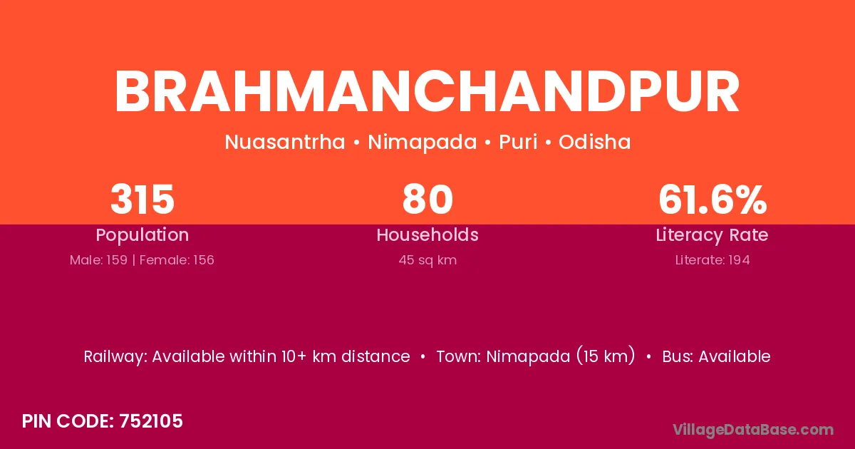 Brahmanchandpur village has a total population of 315 people, of which 159 are males and 156 are females.