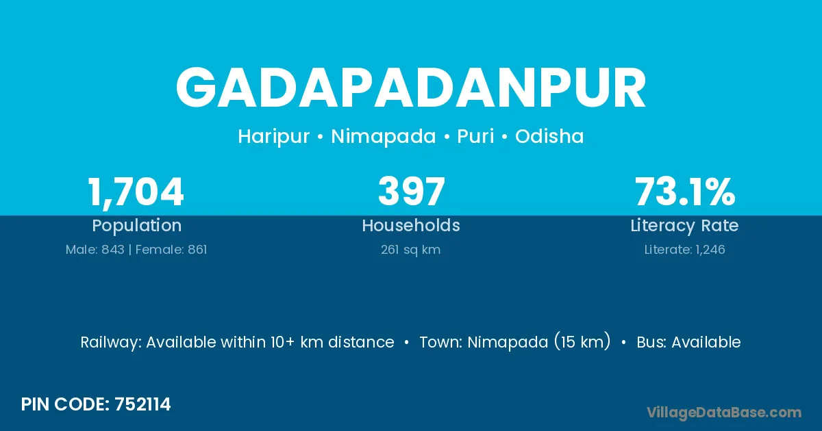 Nimapada (15 km) is the nearest town to Gadapadanpur village for major economic activities and is located approximately 15 km away.