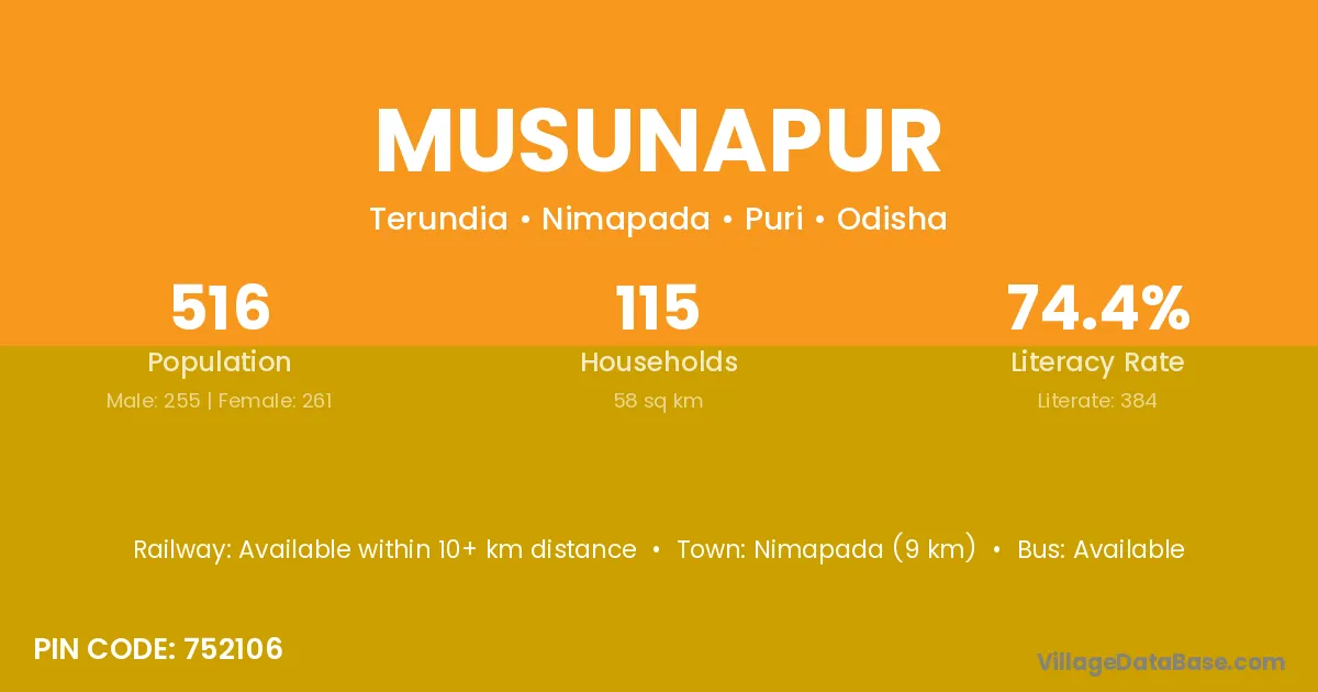 Musunapur village has a total population of 516 people, of which 255 are males and 261 are females.