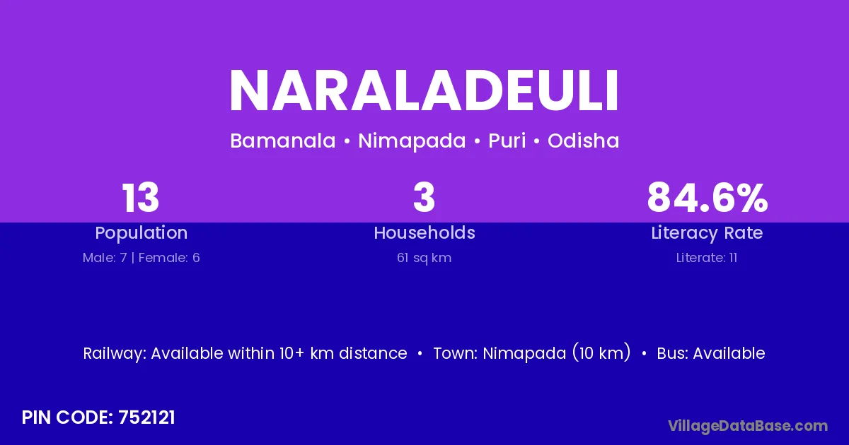 Naraladeuli village has a total population of 13 people, of which 7 are males and 6 are females.