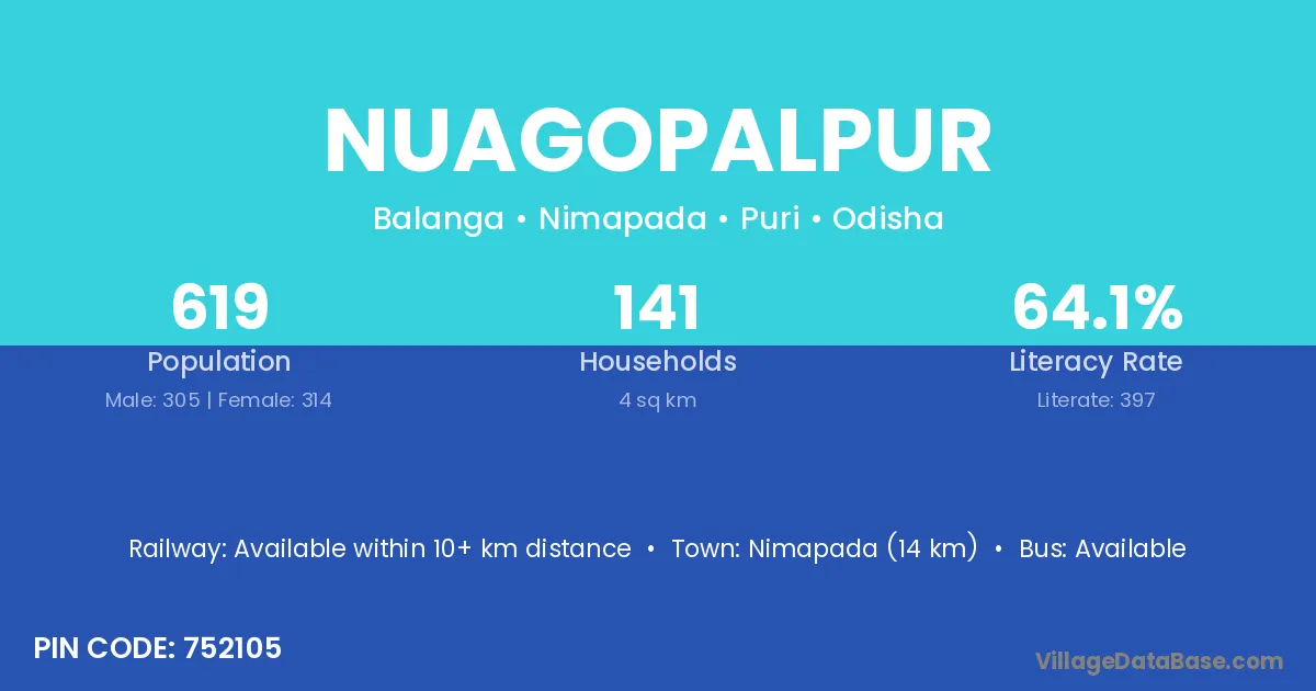 Nimapada (14 km) is the nearest town to Nuagopalpur village for major economic activities and is located approximately 14 km away.
