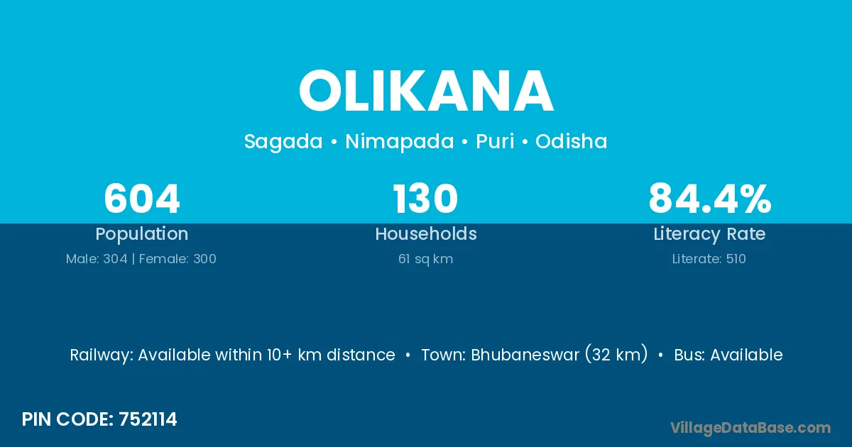 Olikana village has a total population of 604 people, of which 304 are males and 300 are females.