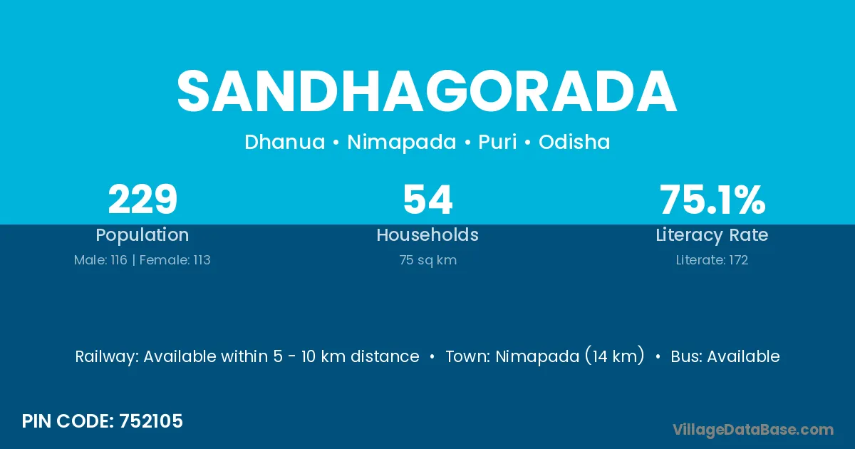 Sandhagorada village has a total population of 229 people, of which 116 are males and 113 are females.