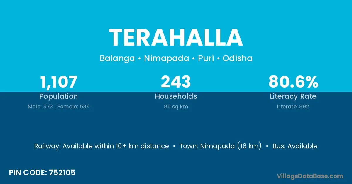 Nimapada (16 km) is the nearest town to Terahalla village for major economic activities and is located approximately 16 km away.