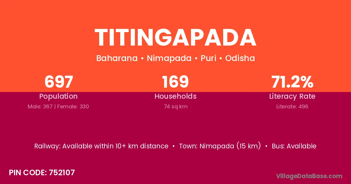Titingapada village has a total population of 697 people, of which 367 are males and 330 are females.