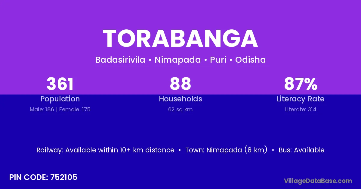 Torabanga village has a total population of 361 people, of which 186 are males and 175 are females.