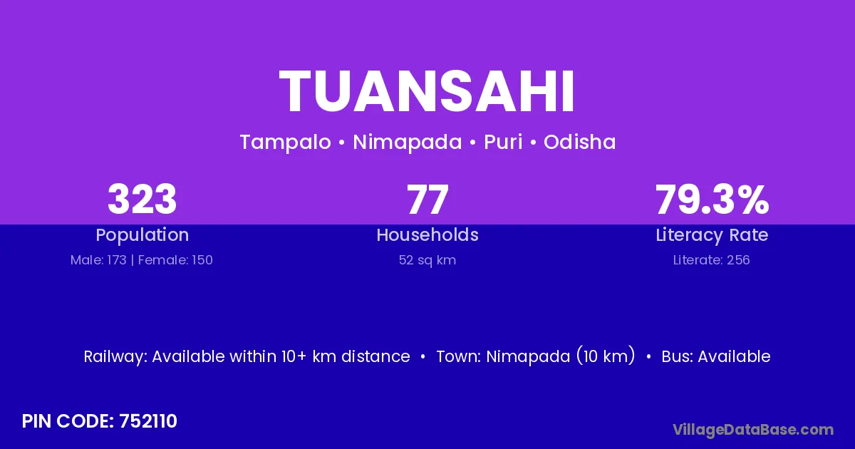 Nimapada (10 km) is the nearest town to Tuansahi village for major economic activities and is located approximately 10 km away.