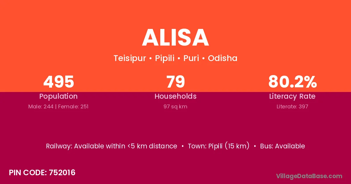Pipili (15 km) is the nearest town to Alisa village for major economic activities and is located approximately 15 km away.