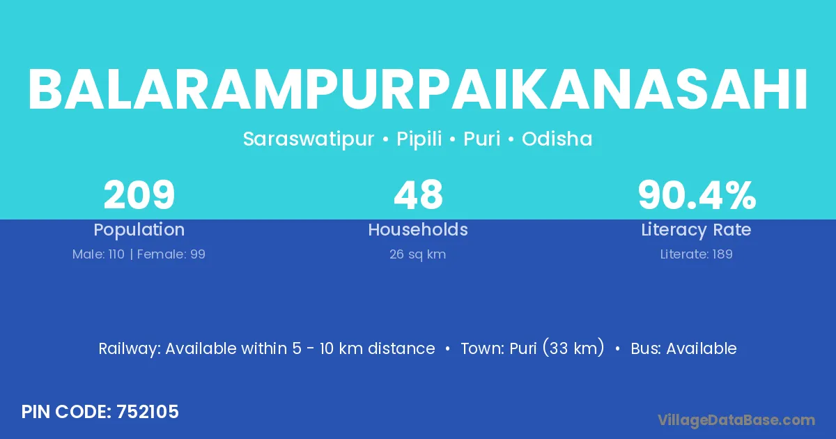 Puri (33 km) is the nearest town to Balarampurpaikanasahi village for major economic activities and is located approximately 33 km away.