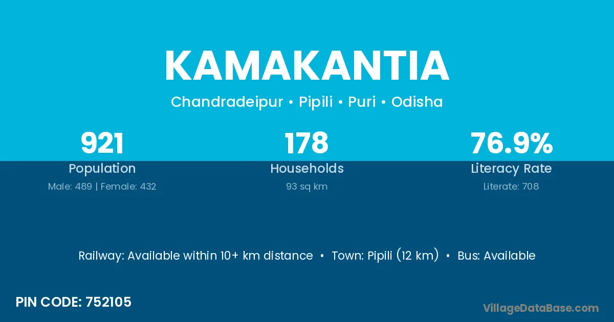 Kamakantia village has a total population of 921 people, of which 489 are males and 432 are females.