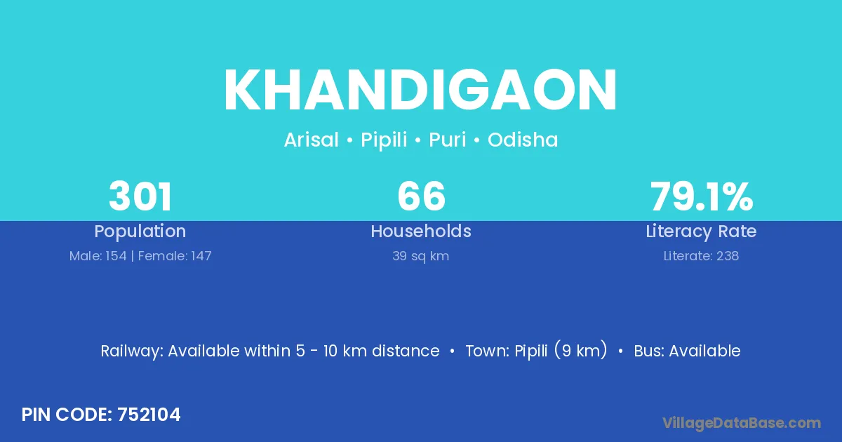 Pipili (9 km) is the nearest town to Khandigaon village for major economic activities and is located approximately 9 km away.