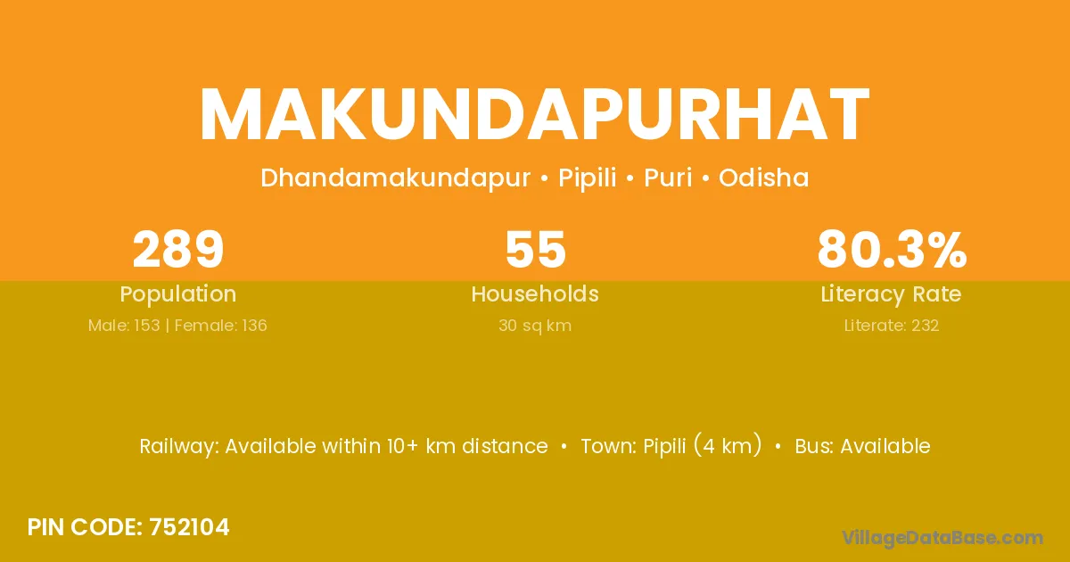 Pipili (4 km) is the nearest town to Makundapurhat village for major economic activities and is located approximately 4 km away.