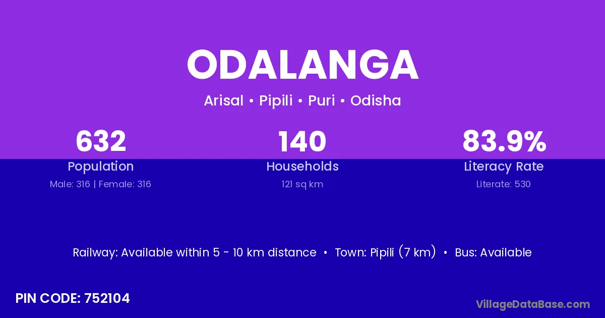 Pipili (7 km) is the nearest town to Odalanga village for major economic activities and is located approximately 7 km away.