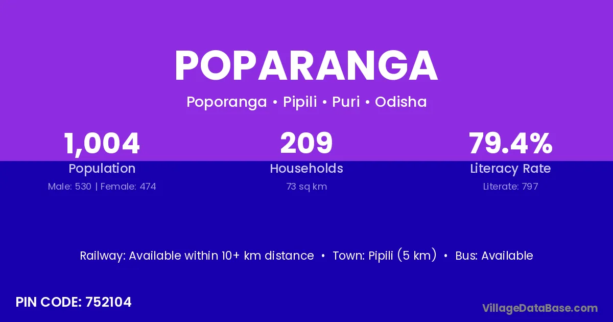 Pipili (5 km) is the nearest town to Poparanga village for major economic activities and is located approximately 5 km away.