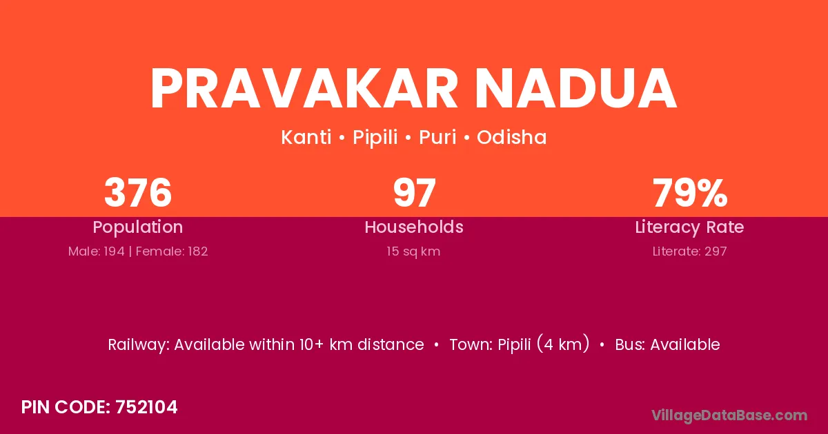 Pipili (4 km) is the nearest town to Pravakar Nadua village for major economic activities and is located approximately 4 km away.