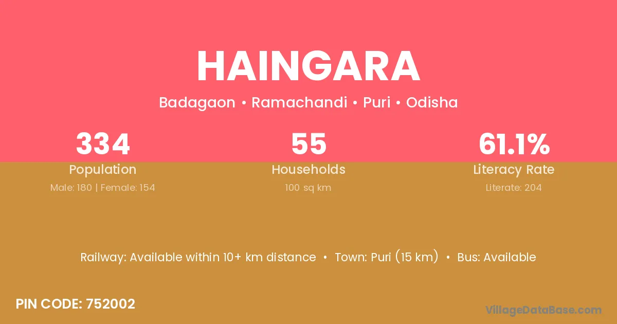 Puri (15 km) is the nearest town to Haingara village for major economic activities and is located approximately 15 km away.