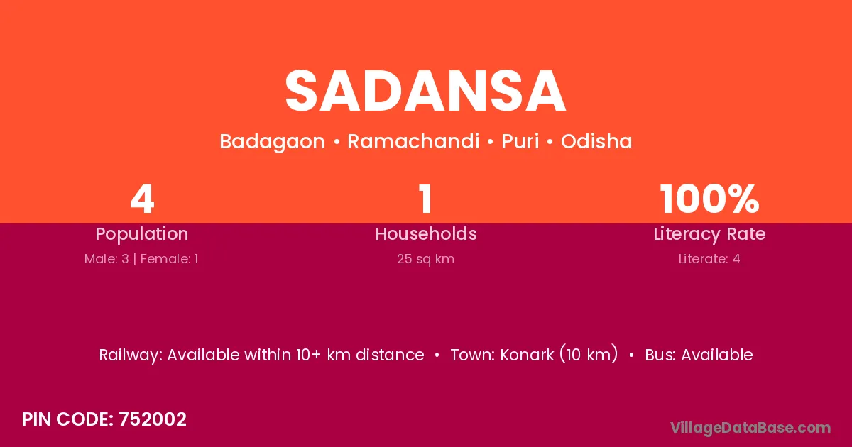 Konark (10 km) is the nearest town to Sadansa village for major economic activities and is located approximately 10 km away.
