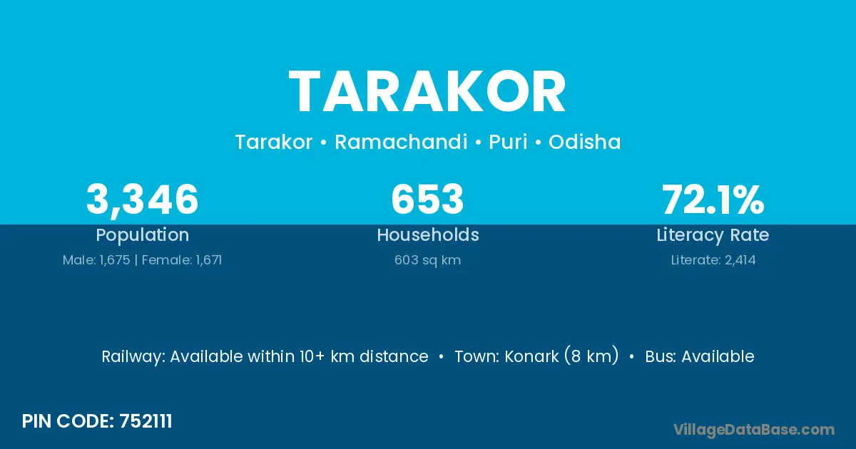 Konark (8 km) is the nearest town to Tarakor village for major economic activities and is located approximately 8 km away.