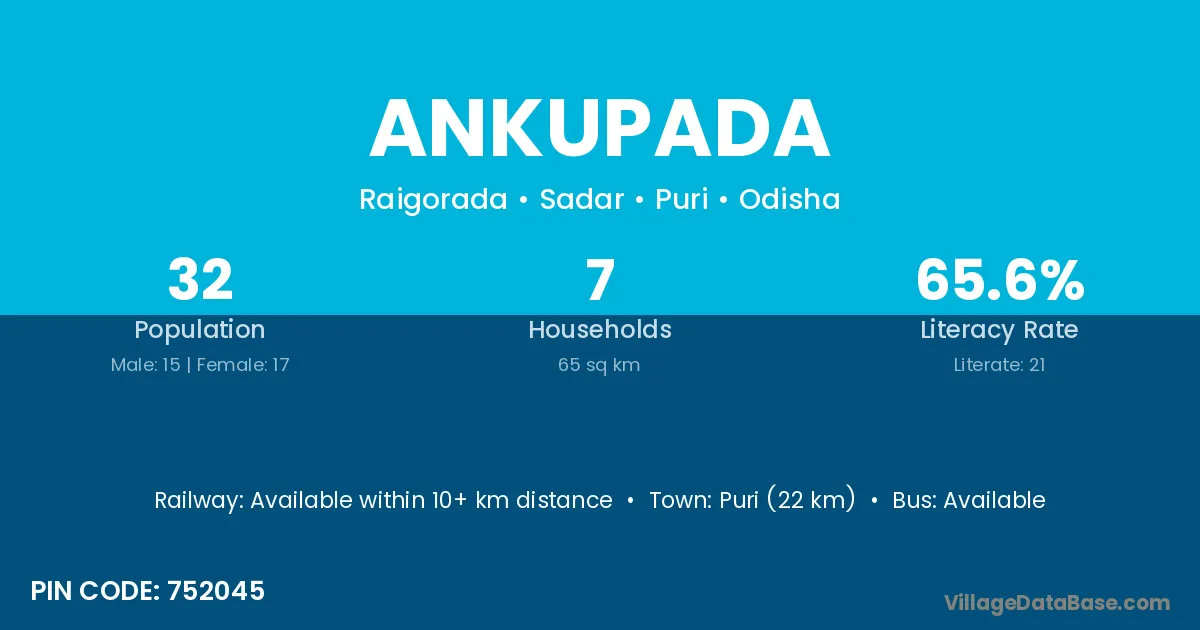Puri (22 km) is the nearest town to Ankupada village for major economic activities and is located approximately 22 km away.