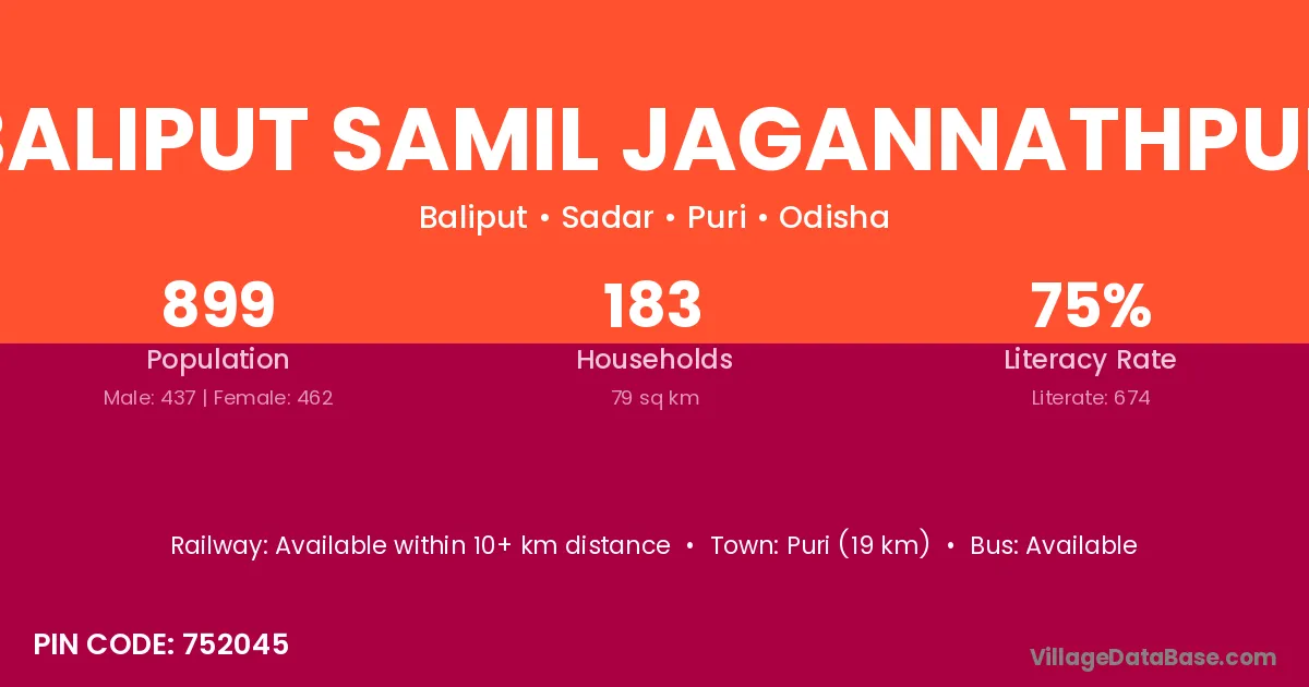 Puri (19 km) is the nearest town to Baliput Samil Jagannathpur village for major economic activities and is located approximately 19 km away.